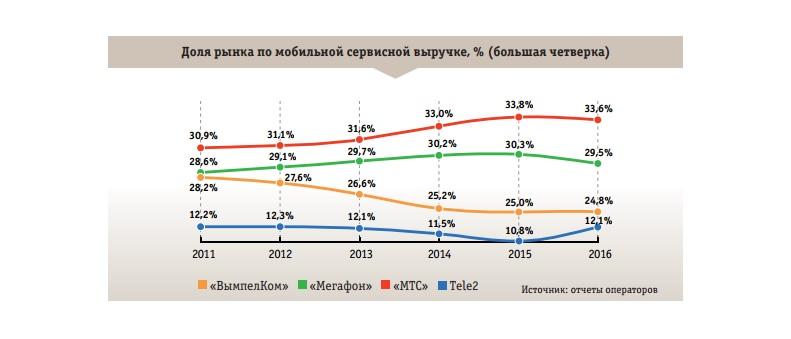 В 2016 г. на рынке сотовой связи «не было каких-либо ярких предложений» и «сколь-нибудь существенной дифференциации», отмечают авторы доклада. «Операторы молниеносно повторяют любые ходы и инициативы друг друга, предлагая клиенту по сути одинаковый продукт», - говорится в докладе.