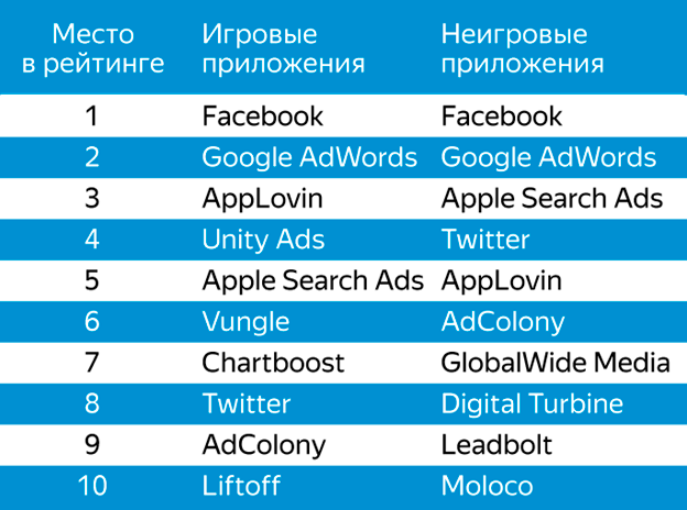 Самой эффективной платформой в шестой версии рейтинга эффективности от AppsFlyer стала Facebook — соцсеть является главным медиаисточником как для мобильных игр, так и для неигровых приложений; на втором месте — Google. На третьем: для игровых приложений — AppLovin, неигровых — Apple Search Ads — сравнительно новая сеть.