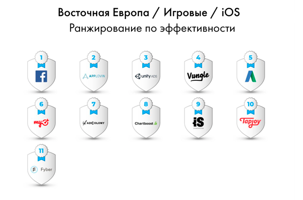 По региону Восточная Европа, к которому в данном рейтинге относится Россия, в список вошли такие компании, как «Яндекс», myTarget и Mobio. Для игровых приложений (среди российских платформ) популярнее всего оказался myTarget, для неигровых вместе с myTarget выделились «Яндекс», Mobio, Rocket10.