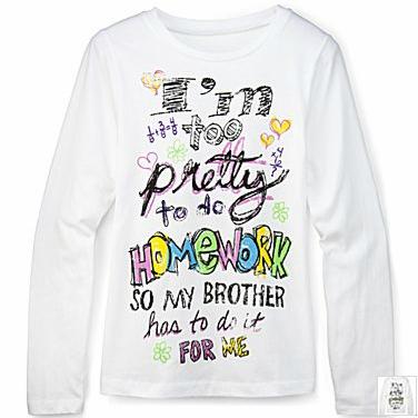 Девичья футболка продавалась на официальном сайте JCPenney за 9,99 доллара. Надпись на ней гласила: «Я слишком хороша, чтобы делать домашнее задание, пусть лучше мой брат сделает его за меня». В описании же на сайте было сказано: «Как можно найти время для домашних уроков, когда вышел новый альбом Джастина Бибера? Она полюбит эту футболку, потому что она так же мила и нахальна, как и сама девушка».
