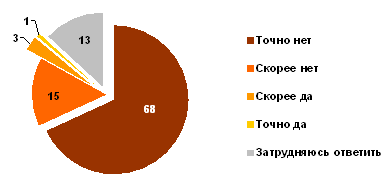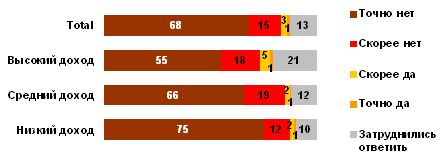 Доля категоричных ответов «точно нет» уменьшается с ростом уровня дохода участников опроса. От 75% в низкодоходной группе населения, 66% - у людей со средним достатком до 55% среди высокодоходников. Соответственно доля положительных ответов несколько увеличивается - от 2% в средне- и низкодоходной группе до 6% у граждан с достатком выше среднего. Интересно другое – с ростом уровня доходов респондентов растет процент затруднившихся ответить на поставленный вопрос.