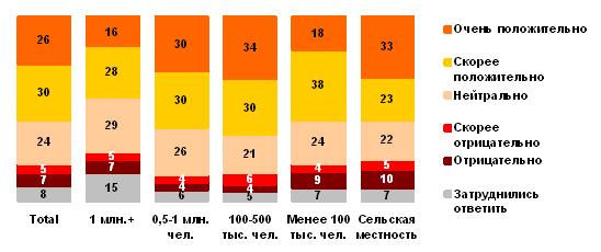 При анализе ответов на этот же вопрос с точки зрения возраста респондентов, существенных отличий не обнаруживается. Разве что, среди молодежи в возрасте от 18 до 24 лет, несколько больше (30%), чем в среднем по выборке, процент людей, у которых данная тема вызывает минимум эмоций, и они обозначают своё отношение как «нейтральное».