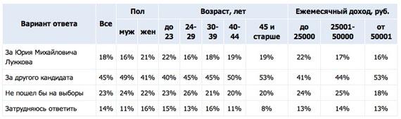 Среди сторонников Лужкова больше женщин (21% против 16% среди мужчин). Кроме того, в группе поддержки столичного мэра преобладают москвичи с доходом до 25 000 руб. в месяц (22%). О смене градоначальника чаще остальных мечтают участники опроса, зарабатывающие свыше 50 000 руб. в месяц (53%). Не пошли бы на выборы мэра 23% участников опроса, по словам которых «выборы у нас — это фарс» и «такие решения не принимаются простыми людьми». Затруднились с ответом 14% москвичей: «Не за кого голосовать, во власти нет честных людей»; «Лужкова нельзя больше держать в этом кресле, но и других кандидатов не видно».