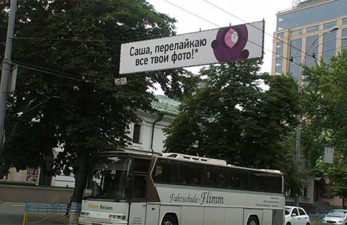 Влюбленный обратился в рекламное агентство и выкупил все свободные ситилайты и растяжки в том районе, где живет возлюбленная. К сожалению, девушка отказала Евгению.