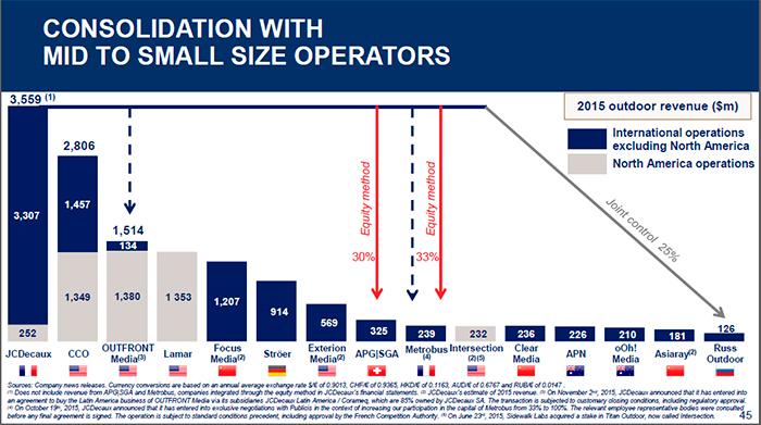 Французская группа JCDecaux, отчитываясь 3 марта по итогам 2015 года, представила свой традиционный рейтинг крупнейших операторов наружной рекламы. И если в прошлый раз лидер российского рынка Russ Outdoor занимал с $252 млн 11-е место, то на этот раз он оказался на последнем, 15-м месте с $162 млн.