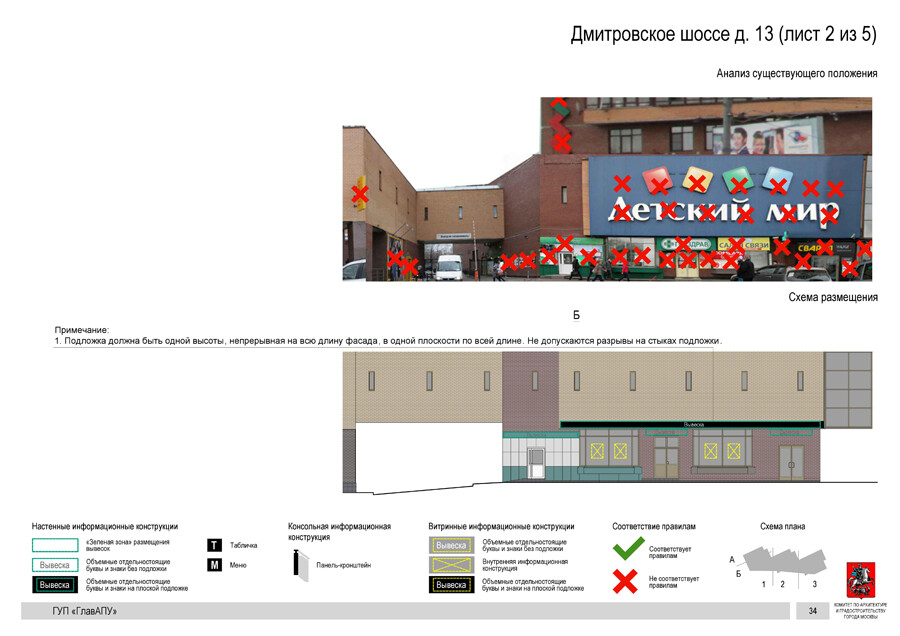 Например, на Дмитровском шоссе придется переделывать на доме № 13 вывески «Детского мира», «Горздрава», «Шоколадницы» и многих других организаций, на доме № 15 – частично книжного магазина «Буква», на доме № 17 – «Почты России», на доме № 21, корпус 2, – «Стильных кухонь» и клиники «Стоматология» и т.п.
