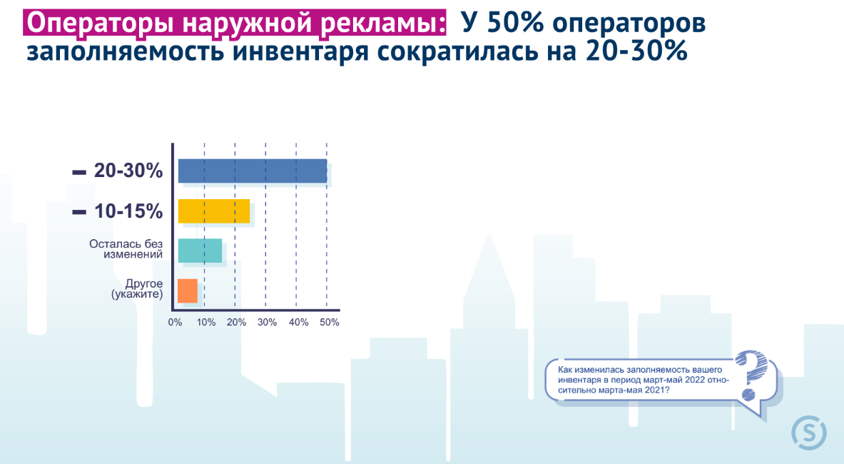 - 64% опрошенных участников рынка ожидают сокращения сегмента OOH в 2022году на 20-30%. 65% респондентов ожидают окончания острой фазы кризиса до конца2022 года.