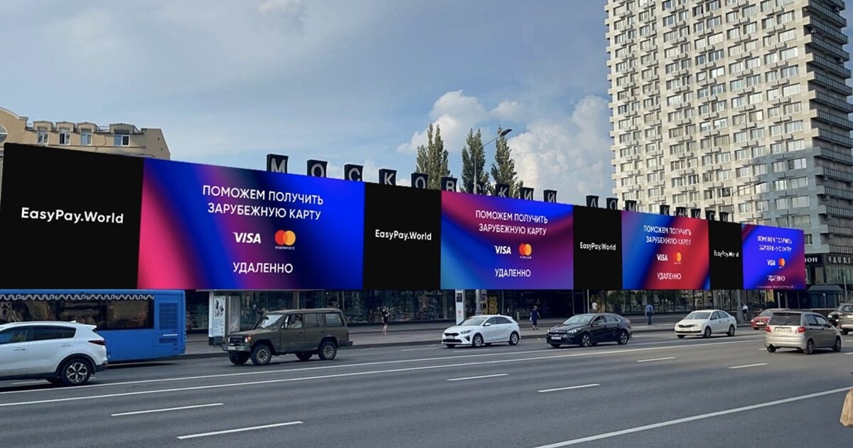 Реклама EasyPay.Worl появилась на медиафасаде Нового Арбата, пишетInc. Этот сервис позволяет удаленно открывать карты виностранных банках.