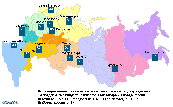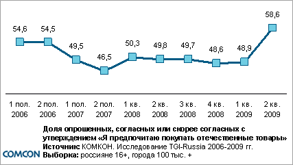 По данным ежеквартального исследования TGI-Russia компании КОМКОН во II квартале 2009 г. значительно по сравнению с I кварталом текущего года выросла доля респондентов, предпочитающих покупать отечественные непродовольственные товары. Во втором квартале в числе тех, кто предпочитает товары российского производства, отнесли себя 58,6% опрошенных в возрасте 16 лет и старше.