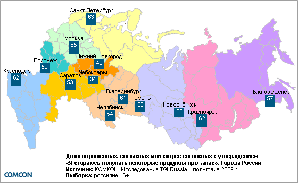 По данным исследования TGI-Russia за I полугодие 2009 г. 56% опрошенных стараются покупать некоторые продукты про запас. Согласно опросу самыми запасливыми оказались жители Москвы (65%) и Санкт-Петербурга (63%). В меньшей степени склонны покупать продукты впрок жители Чебоксар (34%).