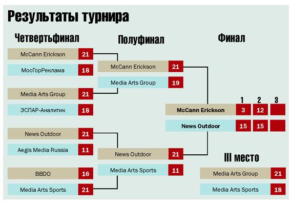Последний раз на высшую ступень пьедестала почета волейболисты News Outdoor поднимались в 2006 г. В этом году команда ведущего outdoor-оператора России была настроена только на победу. В итоге в финале волейболисты News Outdoor обыграли соперников из агентства McCann Erickson, которые заняли, соответственно, второе место. На третьем месте – команда Media Arts Group.