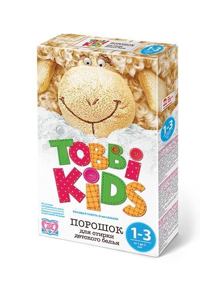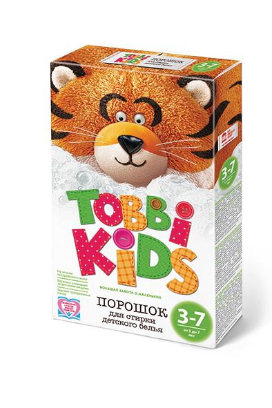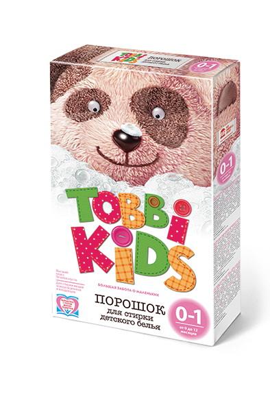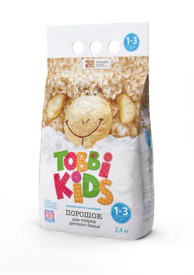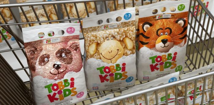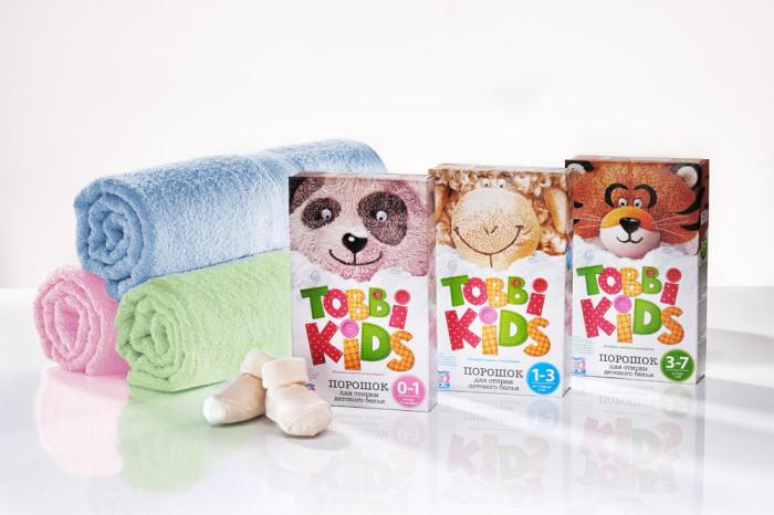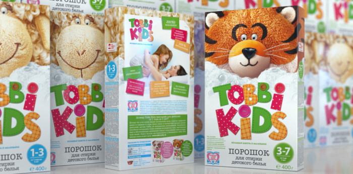Специально разработанные формулы порошков позволили сегментировать ассортиментную линейку в зависимости от возраста ребенка и типов загрязнений, наиболее характерных для того или иного периода жизни. Такой прием использован на рынке впервые и, по мнению специалистов, увеличит доверие целевой аудитории. Для каждого SKU использован свой персонаж, позволяющий облегчить мерчандайзинг и сделать марку эмоционально привлекательной. Бренд Tobbi Kids представлен 3-мя видами стиральных порошков, для каждого из которых разработан специальный образ: панда для порошков, ориентированных на детей от 0 до 1 года, барашек для детей от 1 года до 3 лет и тигренок для порошков для детей от 3 до 7 лет.