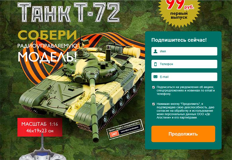 К первому выпуску журнала будет прилагаться DVD с информацией о танке Т-72 и с пошаговыми инструкциями по сборке масштабной модели. Каждый последующий номер будет сопровождаться подробным описанием процесса сборки и наглядными иллюстрациями, которые помогут создать радиоуправляемую модель T-72.