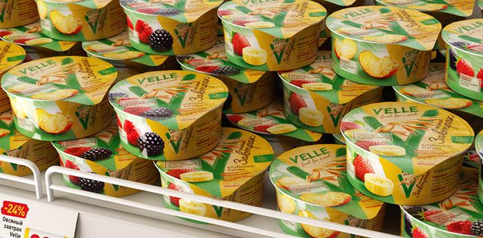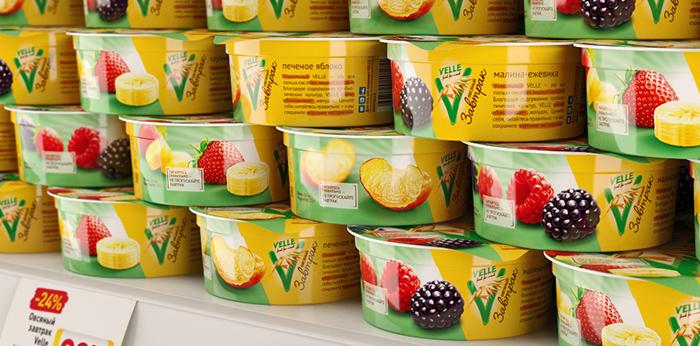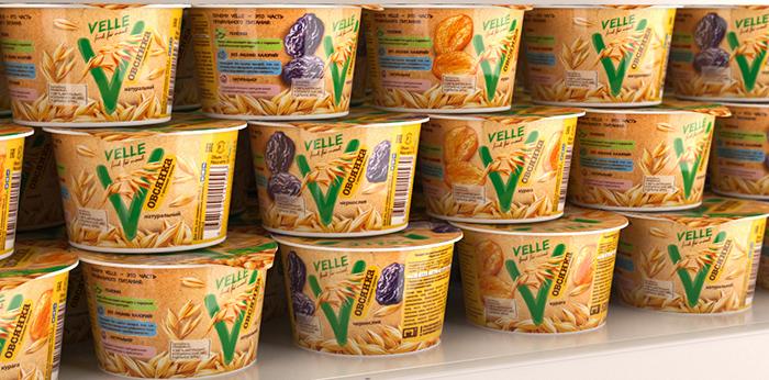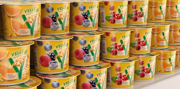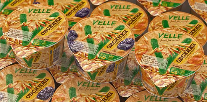 Марка, которая прежде по упаковочному решению была понятна потребителям на интуитивном уровне, теперь четко позиционирует себя англоязычным слоганом Food for mood (еда для настроения) и фразой «Цените себя – питайтесь правильно». Для того чтобы вовлечь потребителя в общение и рассказать о марке больше, на упаковке размещены также иконки социальных сетей и соответствующий копирайт. В целом редизайн Velle сделал линейку яркой, узнаваемой, выделяющейся на полке.