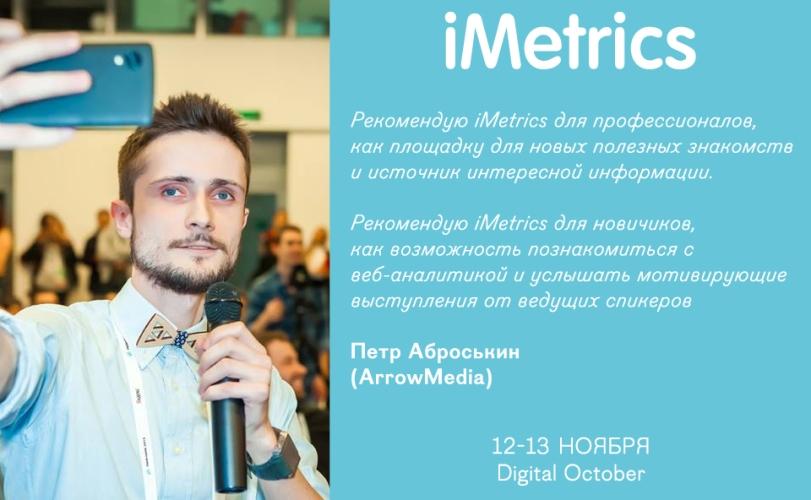 12 и 13 ноября 2015 года в Москве в центре Digital October состоится пятая конференция iMetrics –главное российское профессиональное мероприятие, посвященное веб-аналитике. В 2015 году iMetrics поддерживает статус международной конференции и представляет серию ключевых докладов и мастер-классов от главных спикеров мирового рынка интернет-маркетинга. На мероприятии выступят практикующие специалисты по веб-аналитике крупных российских, западных и европейских брендов и агентств. Одной из ключевых тем конференции станет аналитика и оптимизация в мобайле.