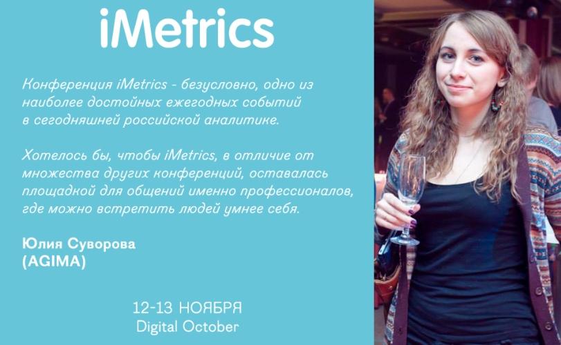 “Конференция iMetrics - безусловно, одно из наиболее достойных ежегодных событий в сегодняшней российской аналитике. В 2014 году для тех, кто хочет не только копаться в цифрах, но действительно менять бизнес своих клиентов, она стала отличной возможностью, чтобы оценить свой собственный уровень и уровень своих коллег и понять, в какую сторону развиваться в ближайший год и более отдалённой перспективе. Хотелось бы, чтобы iMetrics, в отличие от множества других конференций, оставалась площадкой для общений именно профессионалов, где можно встретить людей умнее себя. Пожалуй, это главное” - Юлия Суворова, AGIMA Interactive agency