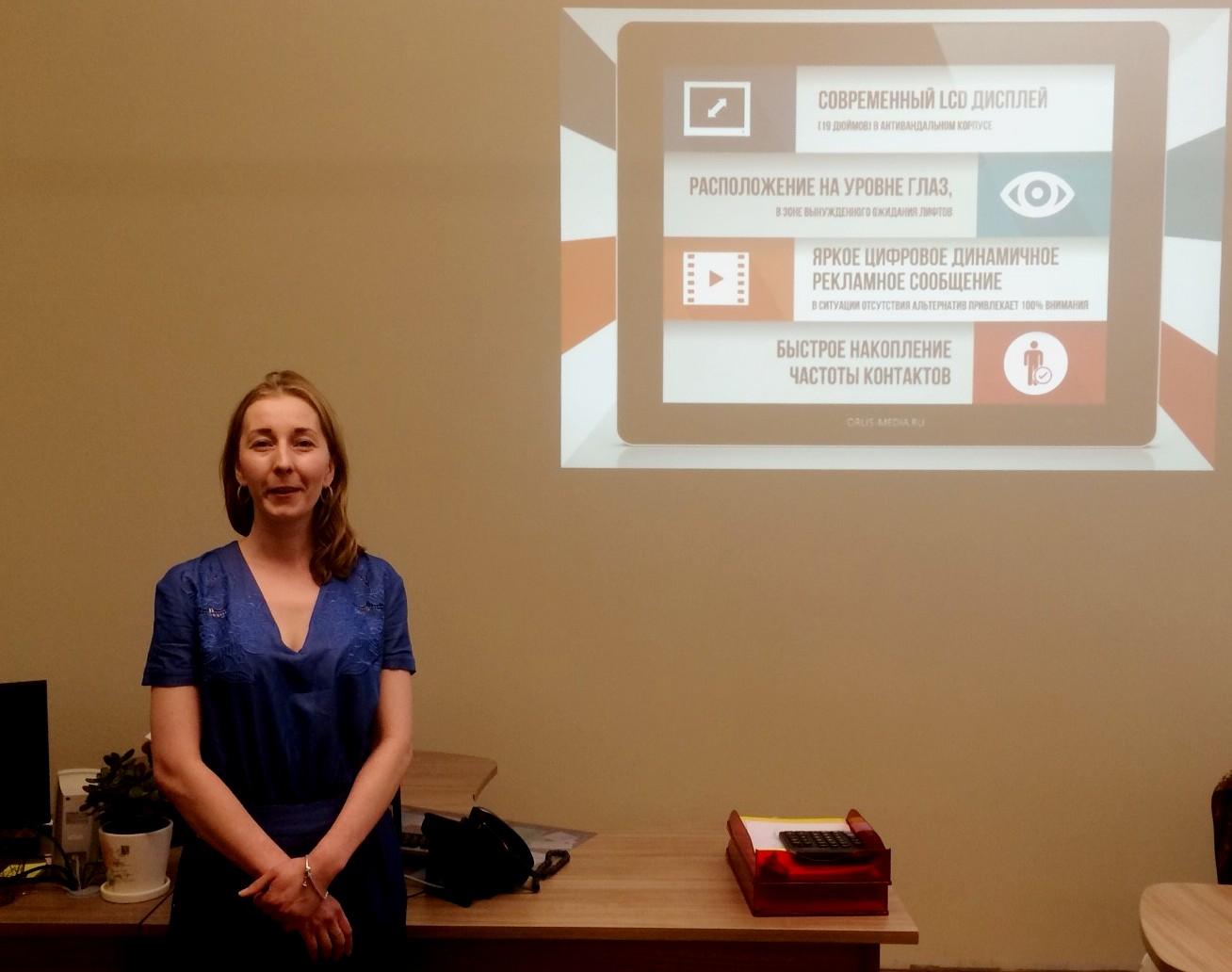 Служба Indoor организовала тренинг на тему «Мониторы в подъездах жилых домов», который провела директор по продажам компании «Orlis Media» Устеникова Ольга. Ольга рассказала об инновационных рекламных носителях – 19-ти дюймовых цветных мониторах, расположенных возле лифтов многоквартирных жилых домов. Данные мониторы помогают донести информацию о товарах и услугах до потребителей рекламы в местах их проживания.