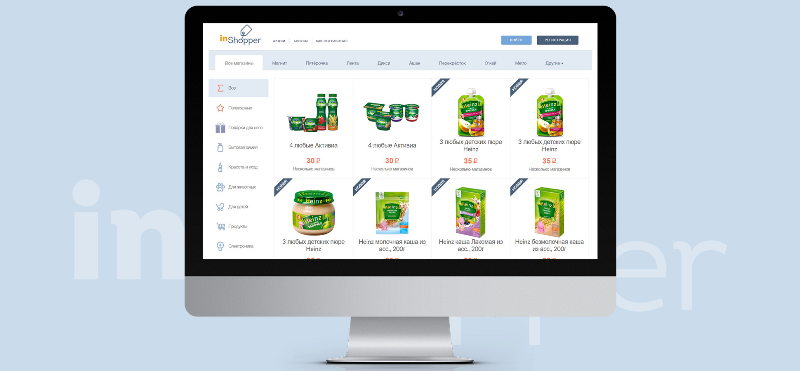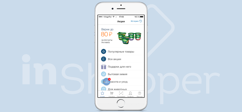 inShopper предлагает бонусы на практически все категории товаров: продукты, детское питание, корм для животных, средства для ухода за красотой, бытовая химия