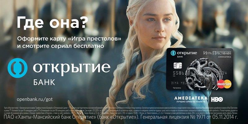Банк «Открытие» запустил масштабную рекламную кампанию по продвижению карты «Игра престолов».Общая креативная идея рекламной кампании: вопросы о судьбе главных героев сериала – жив ли Джон, где Дейенерис, как там Тирион?