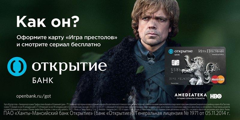 Карта «Игра престолов» появилась в линейке банка в ноябре 2015 года. Изображения из одноименного сериала с гербами домов Вестероса и Железного трона сразу привлекли внимание частных клиентов, и карта понравилась не только поклонникам сериала, но и людям, неравнодушным к оригинальному дизайну. Изображения предоставлены онлайн-сервисом «Амедиатека», который на протяжении нескольких лет показывает «Игру престолов» в России. Цели рекламной кампании – поддержка знания бренда банка и выстраивание позитивных ассоциаций с банком.