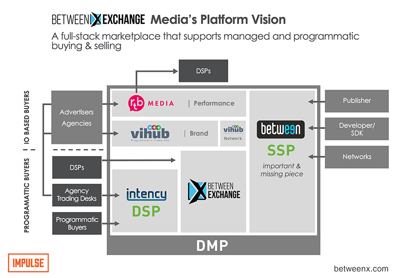 Инвестиционный фонд Impulse VC объединил свои портфельные активы, компании Between Digital, RTB-Media, ViHub и Intency в группу компаний Between Exchange. Получившаяся технологическая основа позволила создать первый на российском рынке Ad Exchange, который дает доступ к рекламному инвентарю на более чем 100 000 площадок рунета, используя все преимущества программатических закупок