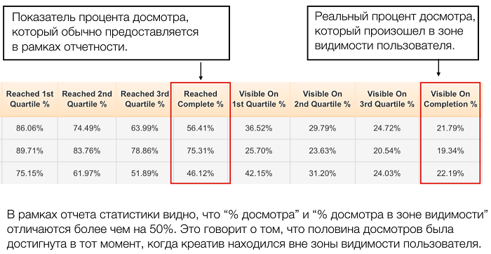 100% видимость обеспечивается согласно международному стандарту MRC / iAB (две последовательные секунды видео находятся более чем в 50% зоне видимости плеера), а также согласно стандарту OpenVV, 100% видимость обеспечивается на каждом квартиле (четверти) видеоролика.