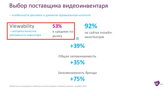 По данным IMHO Vi, уровень видимости видеорекламы на российском рынке находится на уровне 53%. Это значит, что больше чем половина всех оплаченных рекламодателем показов и досмотров in-stream видеорекламы происходят вне зоны видимости пользователя. Как следствие, около половины бюджетов рекламодателей тратится на рекламу, у которой не было даже шанса быть увиденной.