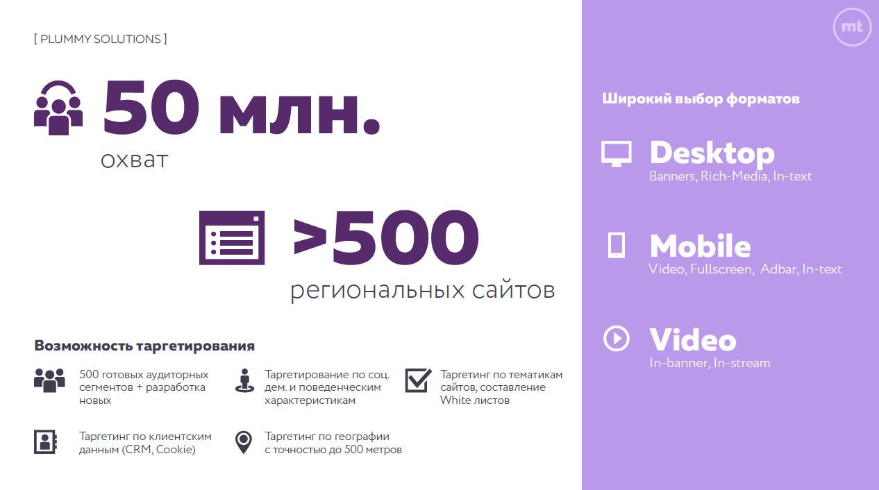 Собственная технологическая платформа компании дает возможность рекламодателям делать специальные предложения для отдельных регионов, а также использовать различные форматы рекламы для desktop и mobile, которые легко интегрируются в сайт, независимо от его верстки и программного обеспечения.