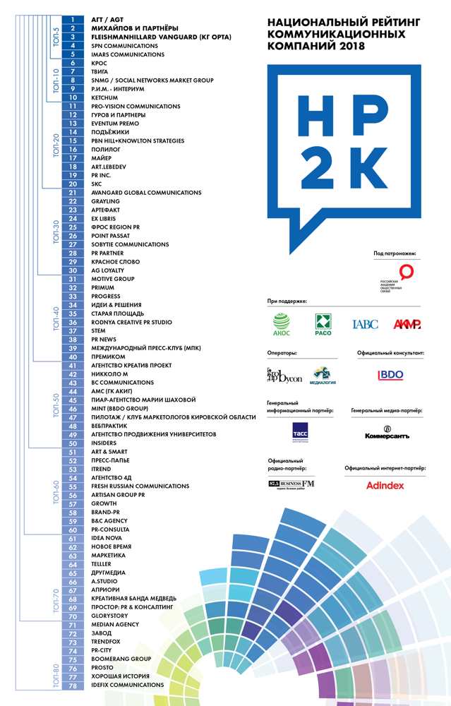 В рейтинге НР2К-2018 приняли участие 78 федеральных и региональных коммуникационных компаний. Во главе рейтинга Коммуникационная группа АГТ / АGТ (1-е место), «Михайлов и Партнёры» (2-е место), FleishmanHillard Vanguard / КГ ОРТА (3-е место). По итогам 2018 года суммарный доход участников рейтинга превысил 25 млрд рублей, при средней выручке на сотрудника в размере 7,5 млн рублей в год.