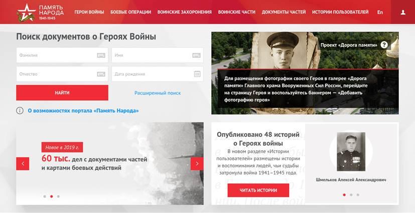 «Память народа» – интернет-портал документов о Второй мировой войне – создан в 2007 году Министерством обороны РФ. В 2008 году проект награждён премией CNews AWARDS как самый социально-значимый ИТ-проект. «Память Народа» является крупнейшим в мире информационным ресурсом открытого доступа, наполняемым всеми имеющимися в военных архивах документами о ходе и итогах основных боевых операций, подвигах и наградах всех воинов Великой Отечественной. В базе данных ресурса собраны официальные сведения о 12 677 857 военнослужащих, погибших и пропавших без вести в годы Великой Отечественной войны.