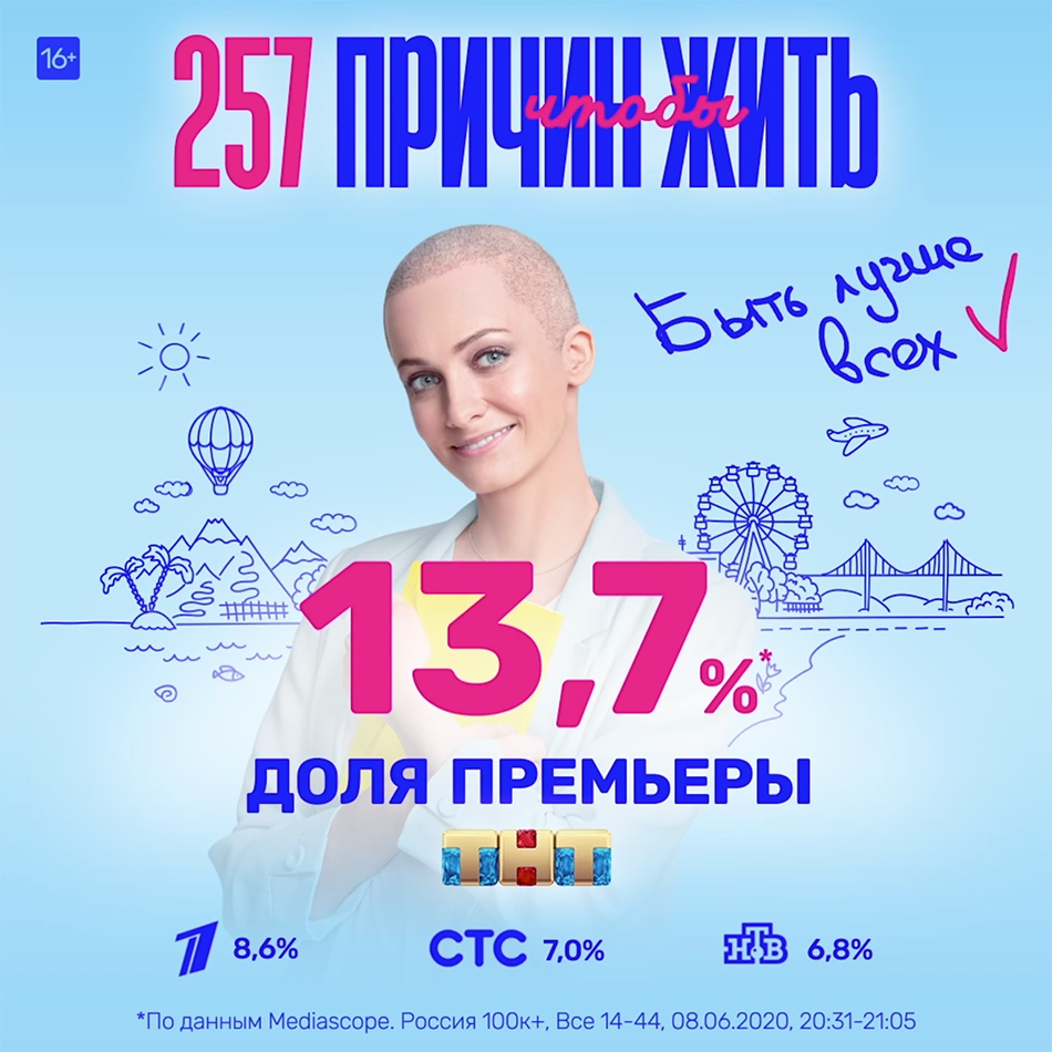 8 июня на телеканале ТНТ начался показ драматической комедии «257 причин, чтобы жить» с Полиной Максимовой в главной роли. История о том, как победившая серьезную болезнь девушка начинает новую жизнь, заинтересовала российскую телеаудиторию: в день премьеры сериал смотрели 13,7% зрителей в возрасте от 14 до 44 лет (15,2% — в возрасте от 18 до 30)*