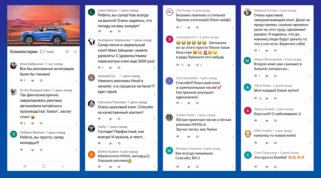 Мы благодарны клиенту Haval за возможность организовать данную интеграцию и группе Би-2 за отличный клип — все это позволило нам вместе осуществить проект, позволивший эмоционально поддержать и зарядить позитивными эмоциями широкую аудиторию».