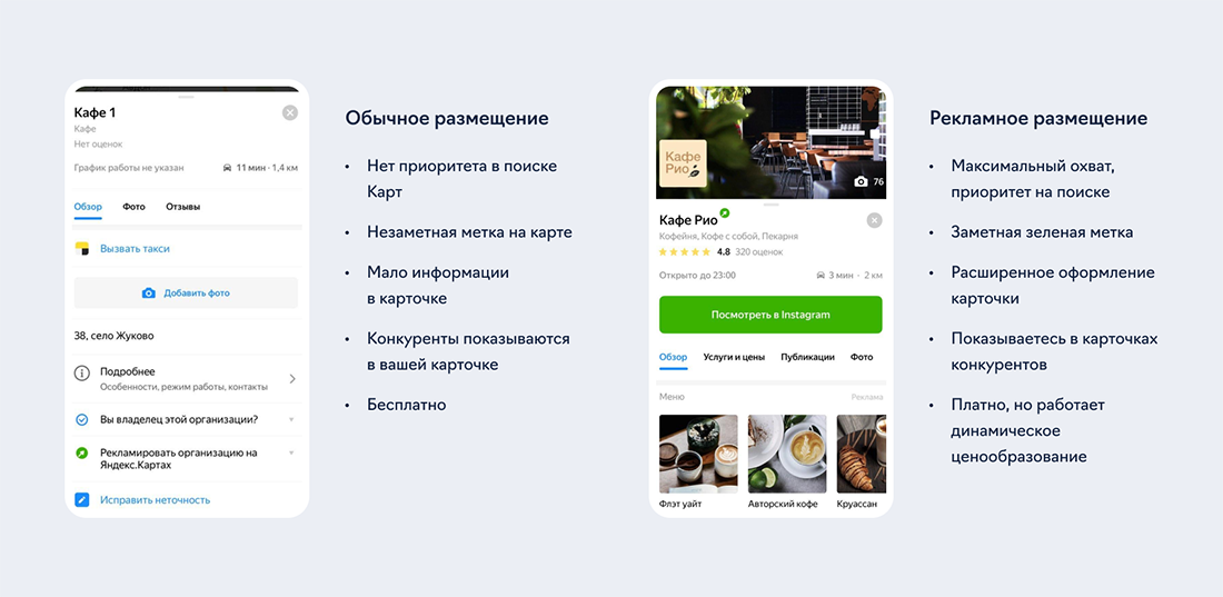 Рекламодатели «Карт» платят за дни размещения (90, 180 или 360 дней), а не за клики или переходы на сайт. В «Картах» действует динамическое ценообразование: например, кофейня на окраине города не будет платить за рекламу столько же, сколько кафе в центре того же города.