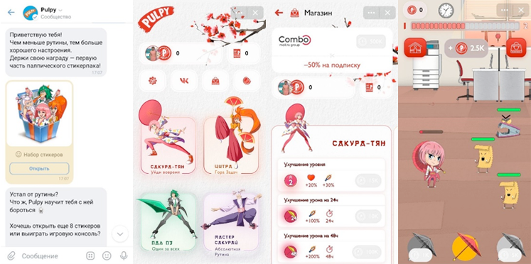 Брендированная онлайн-игра – «Палпические игры», была разработана на платформе VK Mini Apps. Знакомство с ней начинается в чат-боте, где пользователей сразу ждет подарок — стартовый набор антирутинных стикеров. Далее игроку предстоит пройти по четырем уровням, перевоплощаясь в персонажей боевой четверки. Этапы различаются врагами и препятствиями. В любой ситуации героям помогает Pulpy со вкусом «Сакуры» — источник силы, настроения и манны для спецприема.