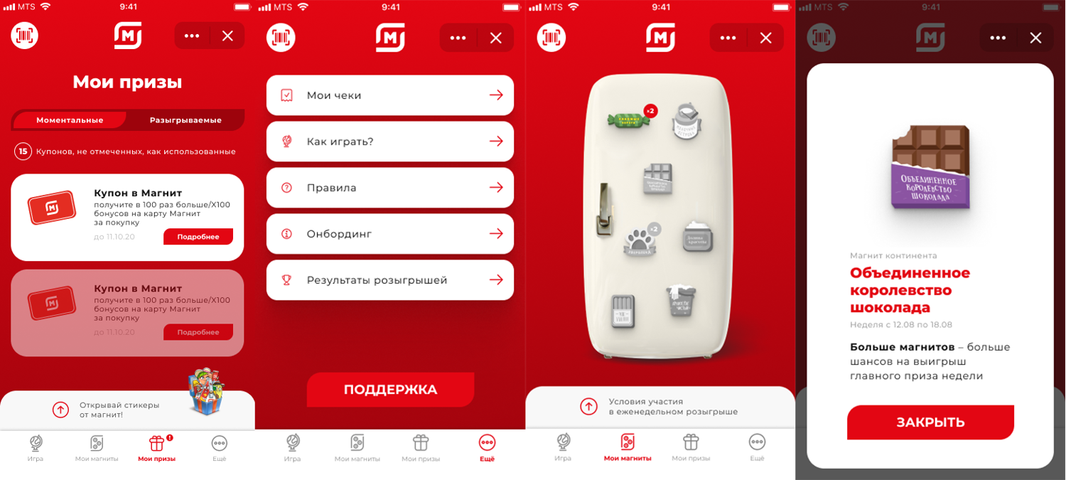 Открывая новую страну, каждый раз игроки получают моментальный приз: брендированные стикеры или купоны на скидку, а также магнитик на виртуальный холодильник в приложении. Чем больше таких магнитов соберут пользователи, тем выше шансы выиграть главные призы недели: iPhone, колонки, наушники и купоны на 1000 и 3000 рублей на покупки в магазинах «Магнит».