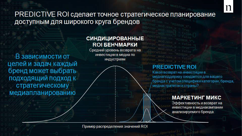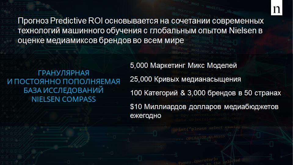 Всего 30–60% медиабюджетов в мире планируется, опираясь на ROI: влияниимедиа на результат бизнеса рекламодателя. Прогноз Predictive ROI основываетсяна сочетании современных технологий машинного обучения с глобальным опытомNielsen в оценке медиамиксов 3000 брендов с общими медиазатратами более $10млрд.