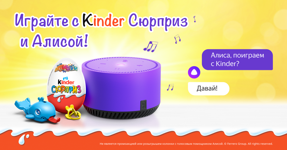Чтобы начать приключение с «Алисой», достаточно сказать ей:«Алиса, поиграем с Kinder!» Она запустит интерактивный квест, в котором поможетребенку и его родителям лучше узнать героев и животных «Kinder Сюрприз», ихсреду обитания, повадки и особенности.