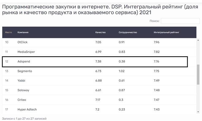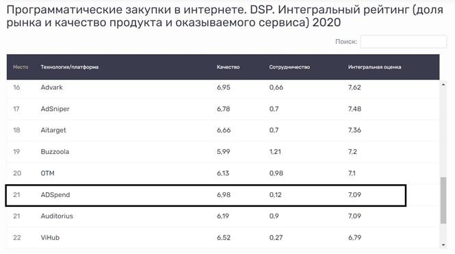 Все это помогло DSP Adspend подняться в рейтинге технологий по сравнению спрошлым годом на 9 позиций по общим показателям и занять второе место впоказателе «качество трафика».