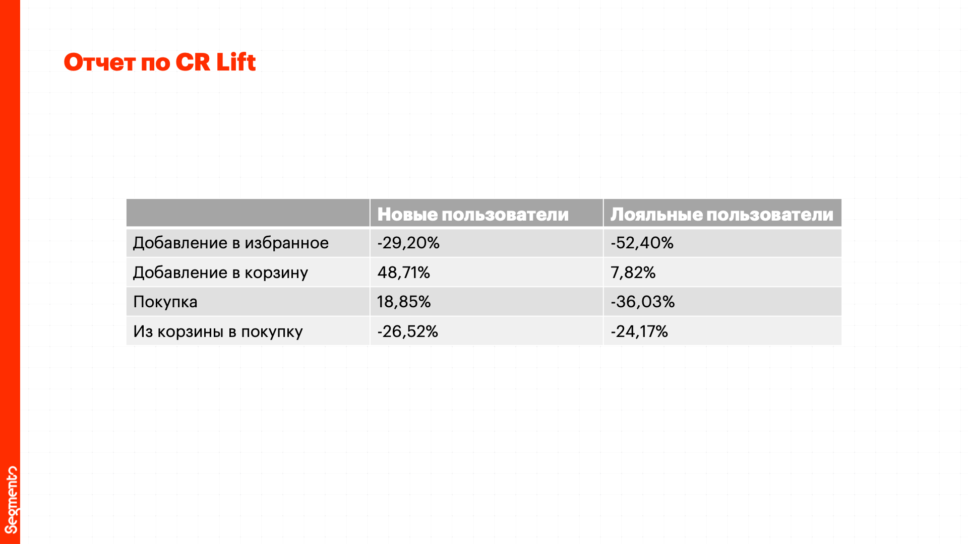 Например, конверсия из просмотра в добавление в корзину для новыхпользователей бренда на 48,71% выше по отношению к пользователям без атрибуции.При этом CR Lift по конверсии из просмотра в покупку для новых пользователейвыше на 18,85% по сравнению с пользователями без атрибуции.