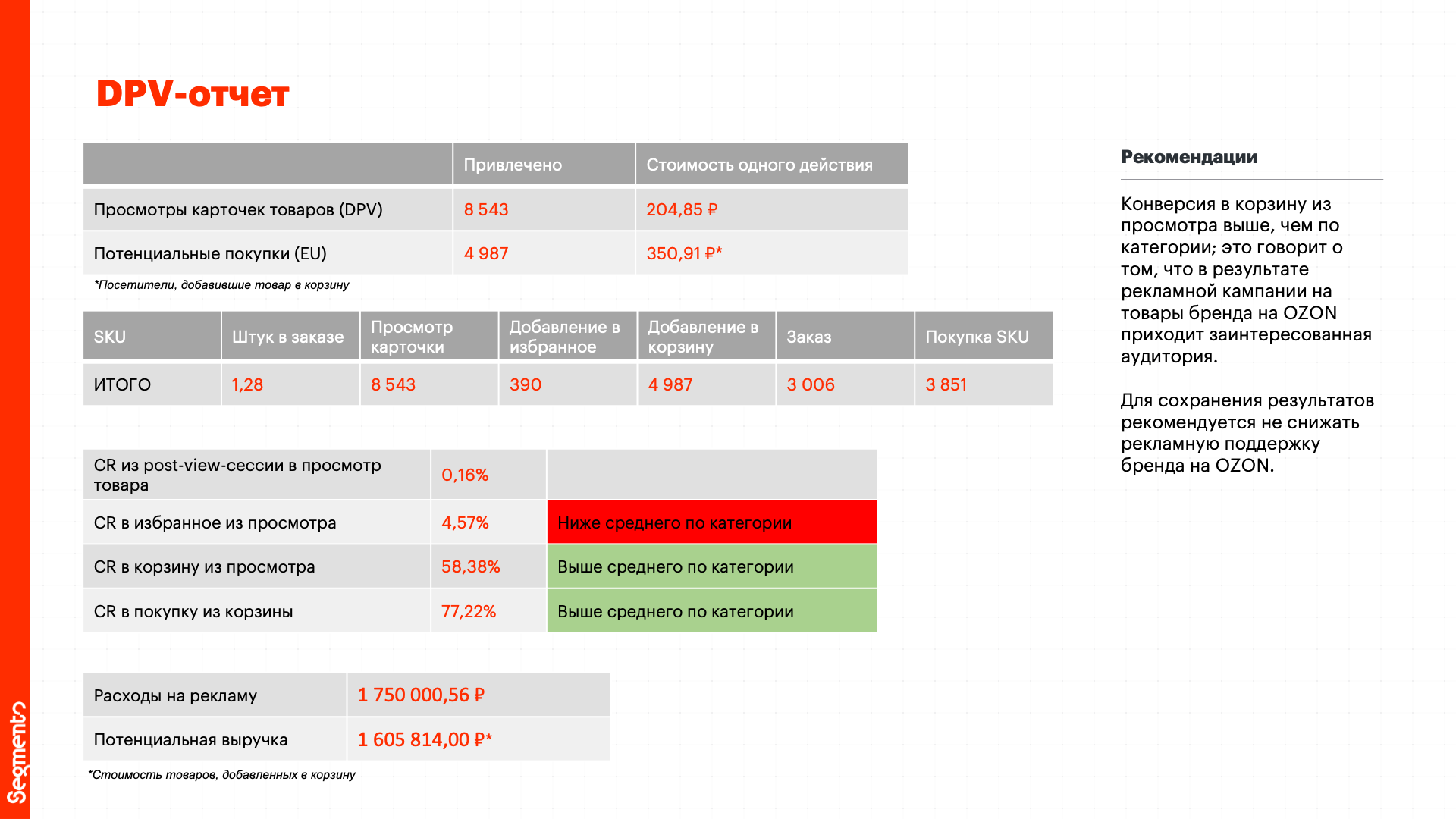 Благодаря данным от Ozon и собственным данным Segmento отчет нагляднопоказывает эффективность рекламной кампании на фоне всех событий бренда.
