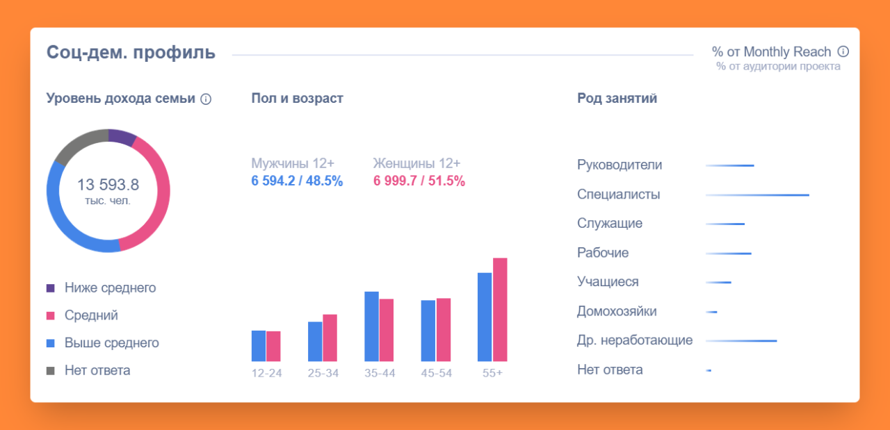 За этот период среди тех, кто ежемесячно контактировал с рекламой надесктопе, преобладают семейные люди (женаты/замужем) — 61% от аудитории, сосредним и выше среднего доходом — 75% от аудитории, имеющие высшее образование— 56% от аудитории.