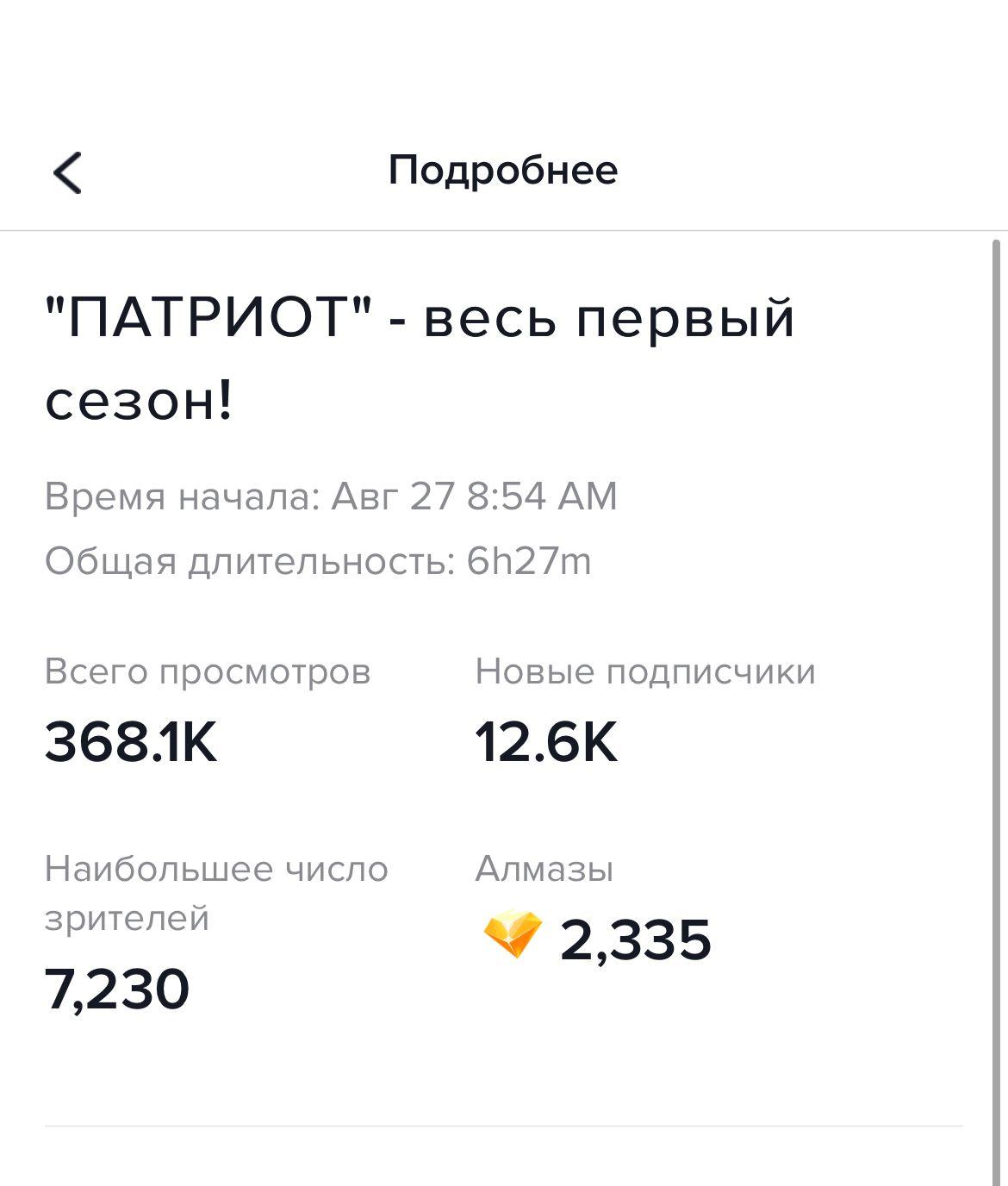 Все 17 серий первого сезона «Патриота» объединили в одинвидеопоток и показали в формате лайвстрима в TikTok. Общий хронометражтрансляции составил 6,5 часов. Это первый случай показа целого сезона сериала вTikTok, который аудитория ТНТ оценила тысячами одобрительных реакций наэфир.