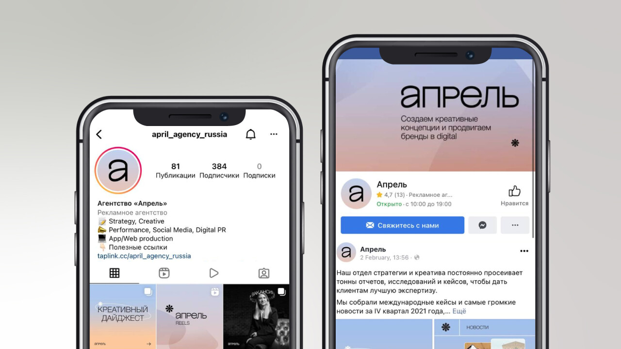 Новый фирстиль создали и для соцсетей «Апреля»: были обновленылоготипы, обложки и дизайн контента в Instagram, Facebook (организация Meta, атакже ее продукты Instagram и Facebook признаны экстремистскими и запрещены натерритории РФ) YouTube и на hh.ru.