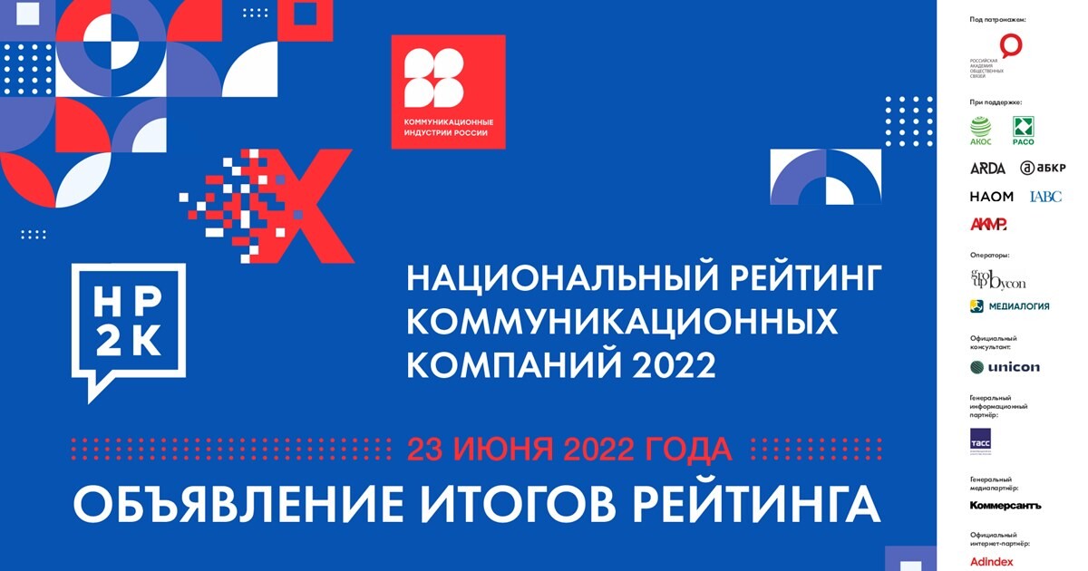 23 июня 2022 года в Москве состоится торжественная церемония объявления итогов Х юбилейного Национального рейтинга коммуникационных компаний НР2К - 2022. Мероприятие состоится в Общественной палате Российской Федерации.