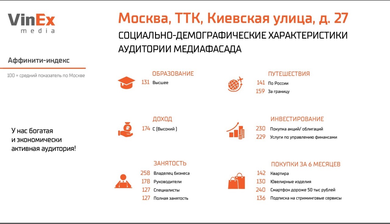 Рекламный носитель VinEx Media работает на транспортный поток, которыйдвижется по направлению к международному деловому центру «Москва-Сити». Такоерасположение конструкции обеспечивает рекламодателям ежедневный доступк премиальной аудитории. Это подтверждается и исследованиямисоциально-демографического профиля аудитории медиафасада. Доля владельцевбизнеса и руководителей, а также людей с высшим образованием в аудиториимедиафасада существенно выше среднего показателя по Москве. Кроме того,аудитория этого носителя отличается высоким уровнем дохода и потребления:приобретает квартиры, ювелирные изделия, дорогие смартфоны, инвестиционныепродукты, активно путешествует, пользуется услугами по управлению финансами,имеет подписки на стриминговые сервисы.