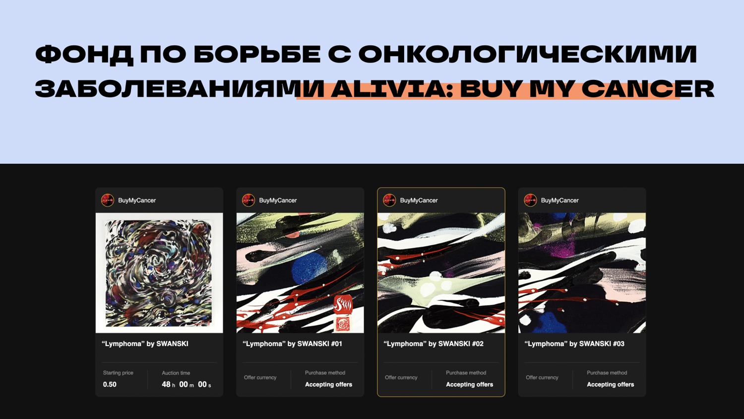 Например, благотворительный фонд Alivia совместно с Национальнымисследовательским институтом онкологии им. Марии Склодовской-Кюри (Варшава)превратили изображения раковых клеток в криптоарт, средства от продажи которогопошли на борьбу с недугом. Отличный пример, как что-то негативное, в частноститяжелый диагноз, превращают в арт-объект, чтобы собрать деньги наблаготворительность.