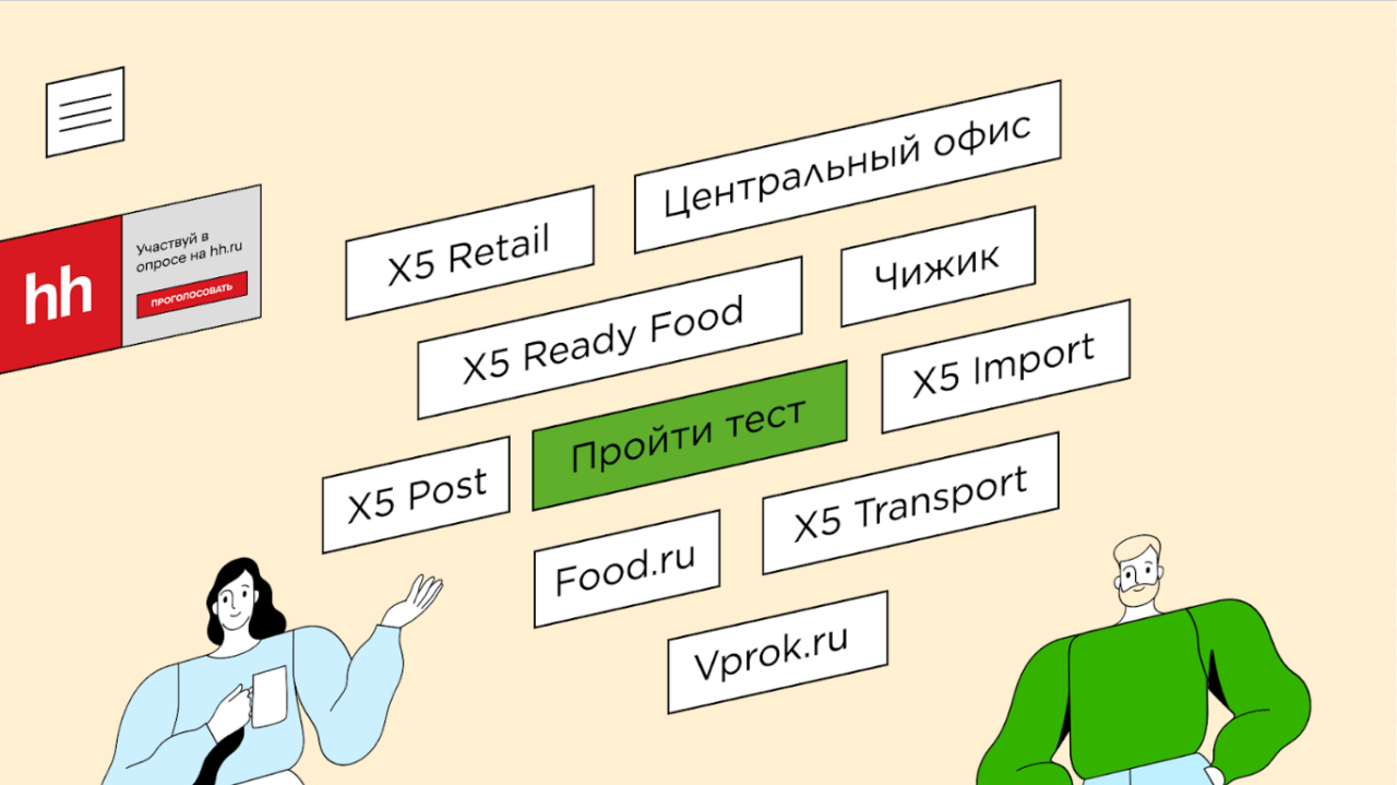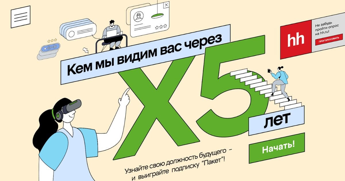 Этот вопрос стал основой небольшого шуточного теста, состоящего из пятивопросов. Ответив на них, люди получали два варианта развития карьеры вХ5 — через 5 и 25 лет. Первый — реалистичный, например руководительсклада. Второй — фантастический, с долей юмора, например директор«Пятерочки» на Венере или скульптор темных материй.