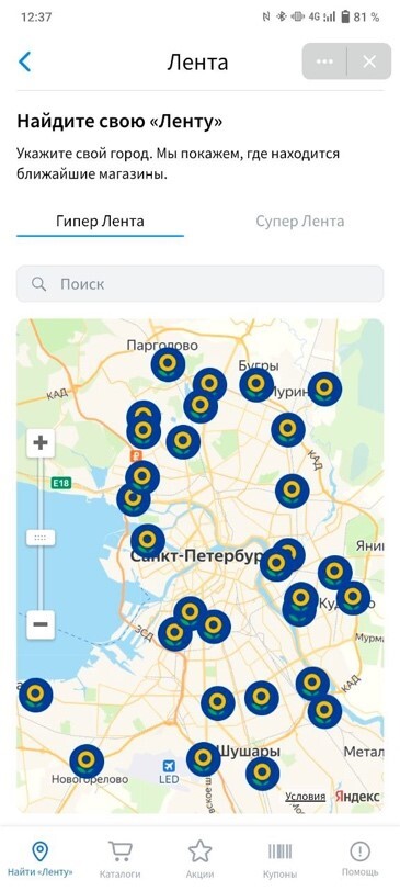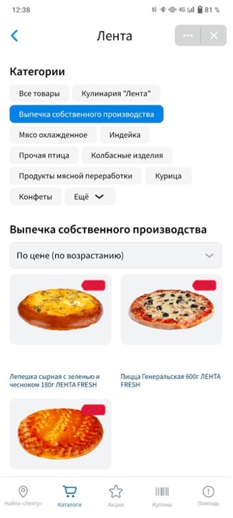 Благодаря использованию геолокации пользователь получает информацию отоварах и предложениях именно в своем регионе. Можно не только узнатьактуальный ассортимент и акции, но и изучить карточки товаров и перейти на сайт«Ленты» для заказа доставки или самовывоза.