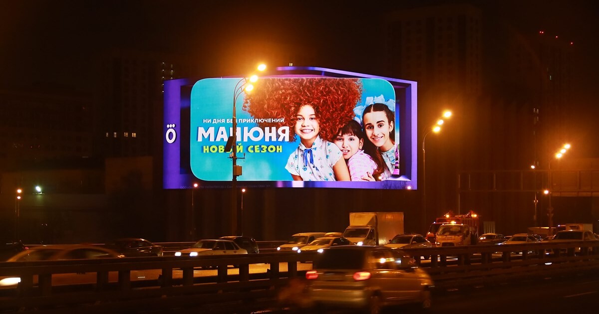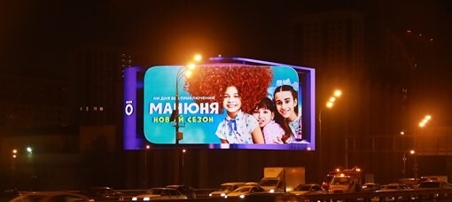 На медиафасаде площадью более 1800 м² сервис представил новые сезоны сериалов «Манюня» и «Предпоследняя инстанция», а также мультифильм «Новое Простоквашино».
