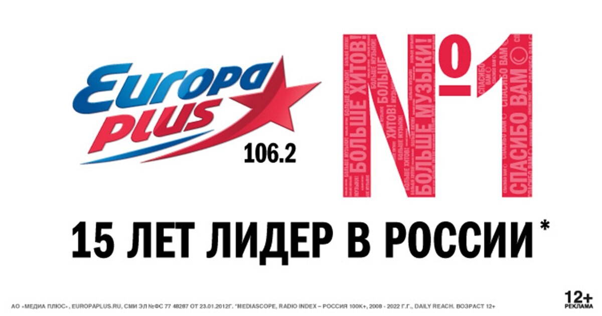 *15 лет подряд «Европа Плюс» — радио №1 среди всех российскихрадиостанций по среднегодовым показателям ежедневной аудитории*. Каждый день еевыбирают более 8,6 млн слушателей (13,5%), еженедельно — более 19,9 млн человек(31,2%), а доля рынка по аудитории станции составляет 7,2%. «Европа Плюс» —крупнейшая сеть музыкальных станций в странах СНГ и Балтии (Mediascope,Radio Index — Россия 100К+, июль — декабрь2022, Daily Reach, Weekly Reach, AQH Share. Возраст12+)